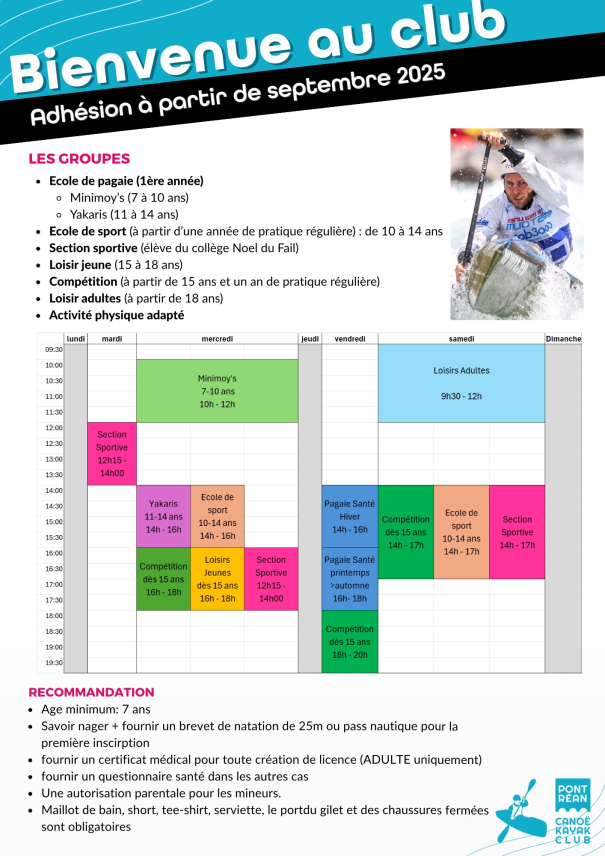 Ci-dessous, vous trouverez le calendrier de la saison sept-2024 – juin 2025 qui précise les horaires des séances encadrées pour les différents groupes.